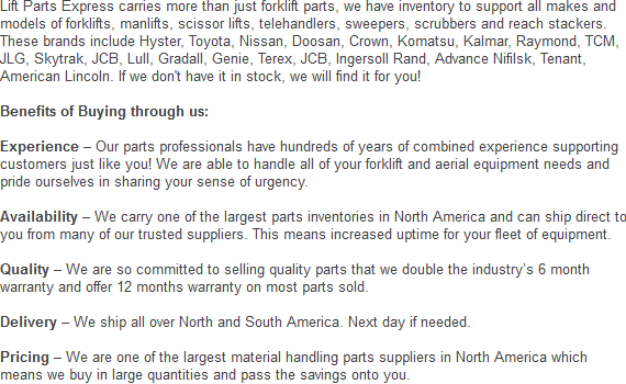 We have great prices on all our forklift parts. Call today to get a quote on one of the parts or attachments we offer. Call us at: